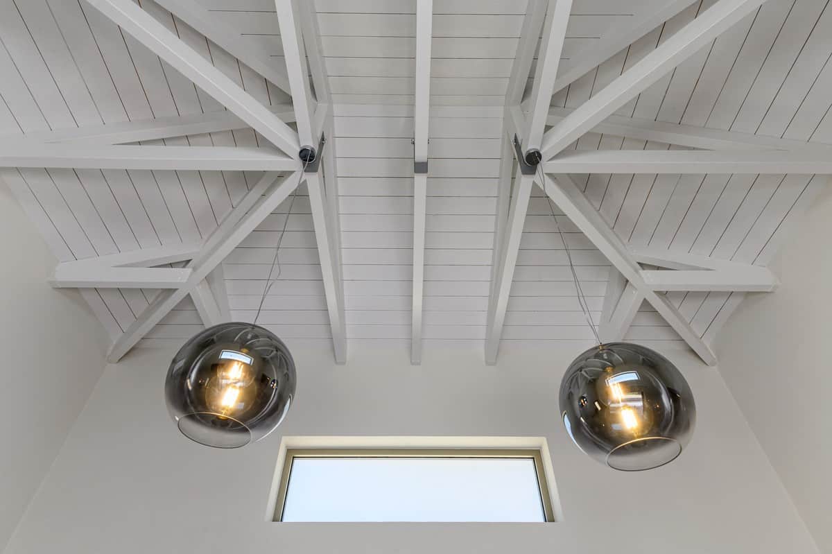 - A spacious living area with elevated vaulted ceilings, opening onto large patio doors