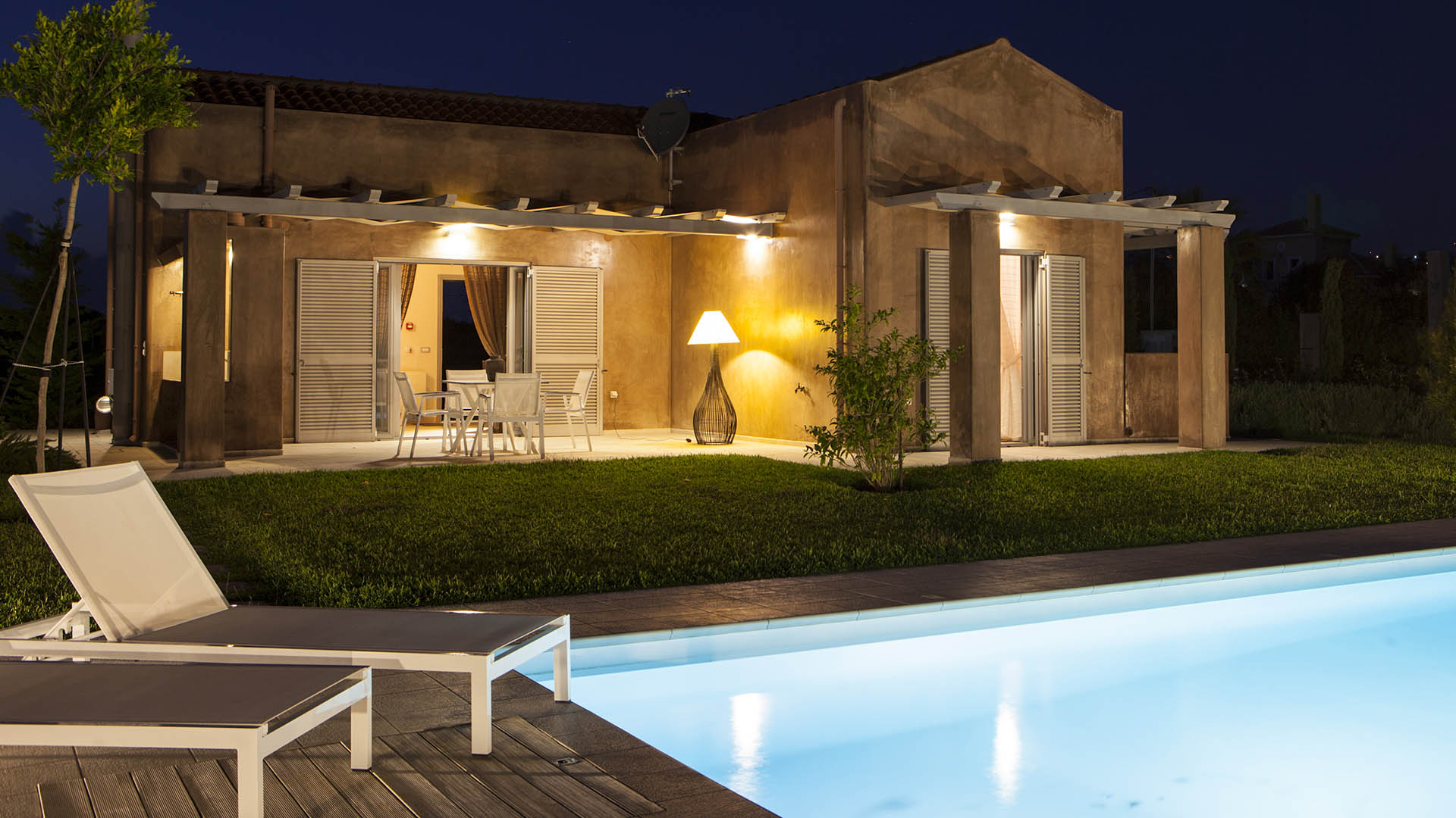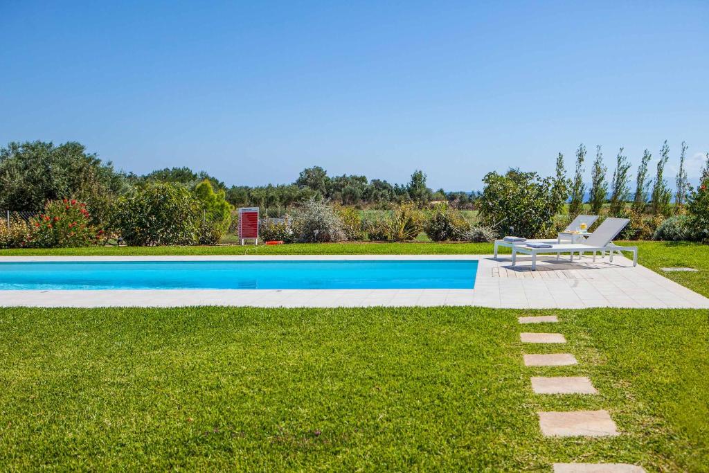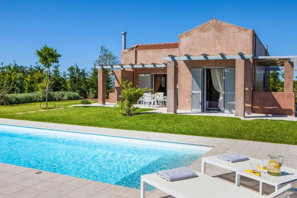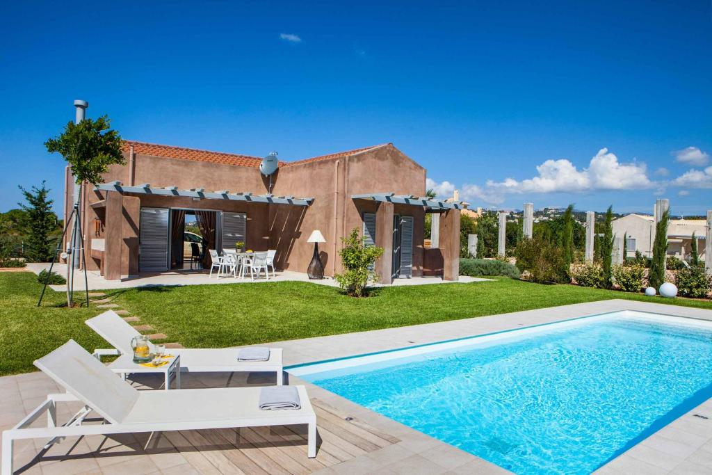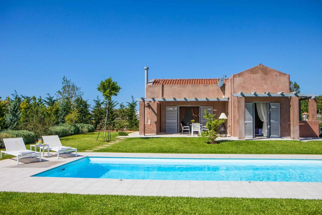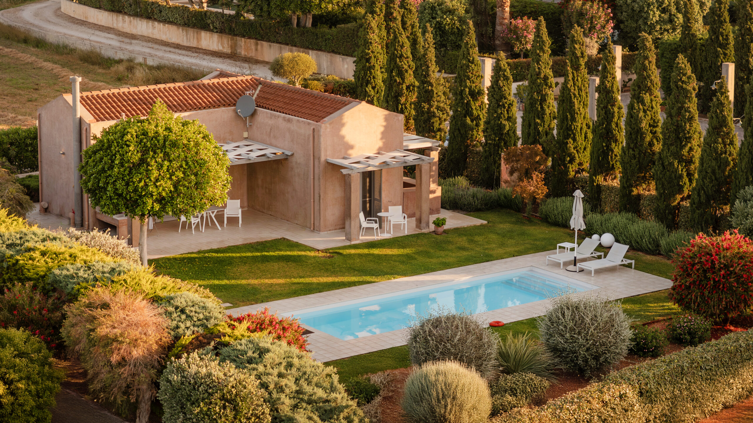 The open-plan layout includes a spacious living area that opens via patio doors onto a large covered terrace, offering picturesque views of the private pool and surrounding countryside. The villa is enveloped by landscaped gardens, providing a tranquil, private escape.