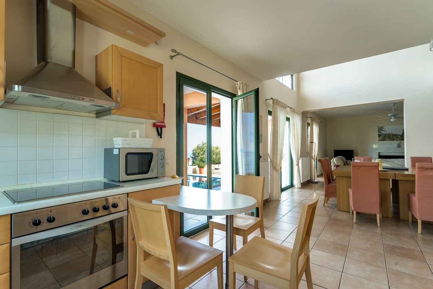 As you arrive, a gated entrance welcomes you in, with private parking and just six steps leading down to the villa. Inside, everything feels calm and thoughtfully put together—neutral tones, comfy sofas, and an open-plan layout that invites you to relax the moment you step through the door. The living and dining spaces are bright and airy, with big patio doors that open straight out to the terrace and pool.