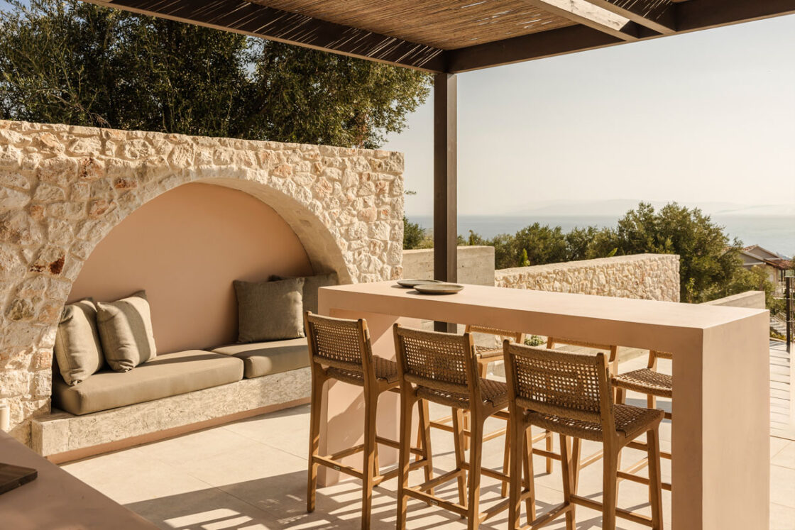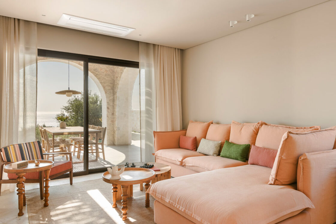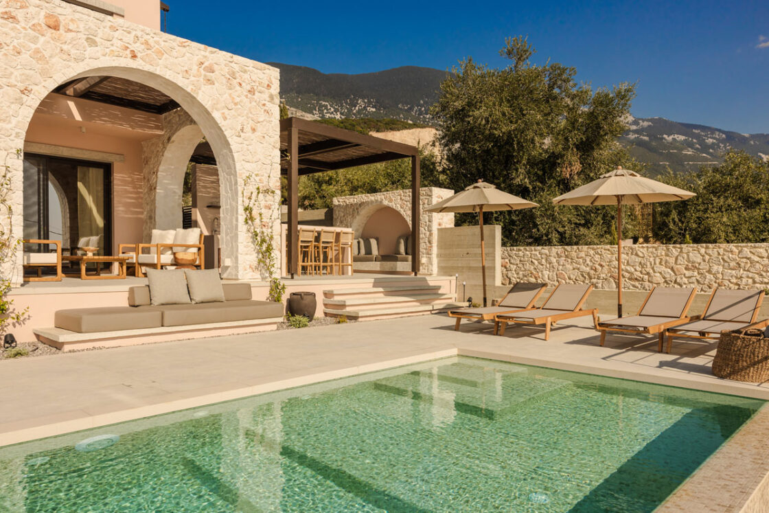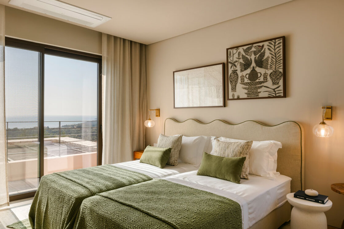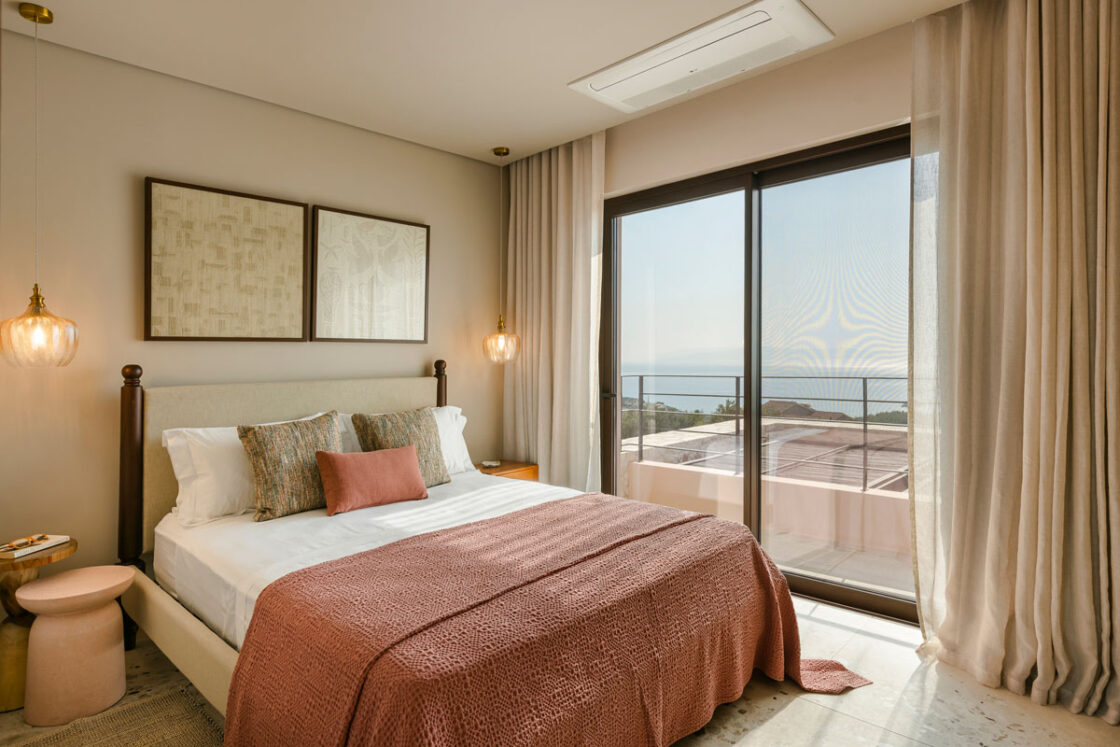 Deluxe Villa is located at the southern end of the Kerami Property with both sea and mountain facing views and is in close proximity to the kids playground. It features one King sized bed and one queen sized bed, spread across 100 m2 of refined living space.