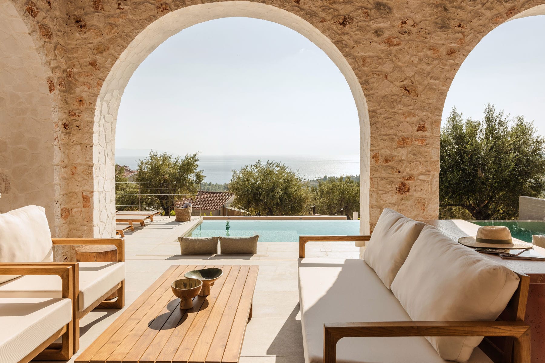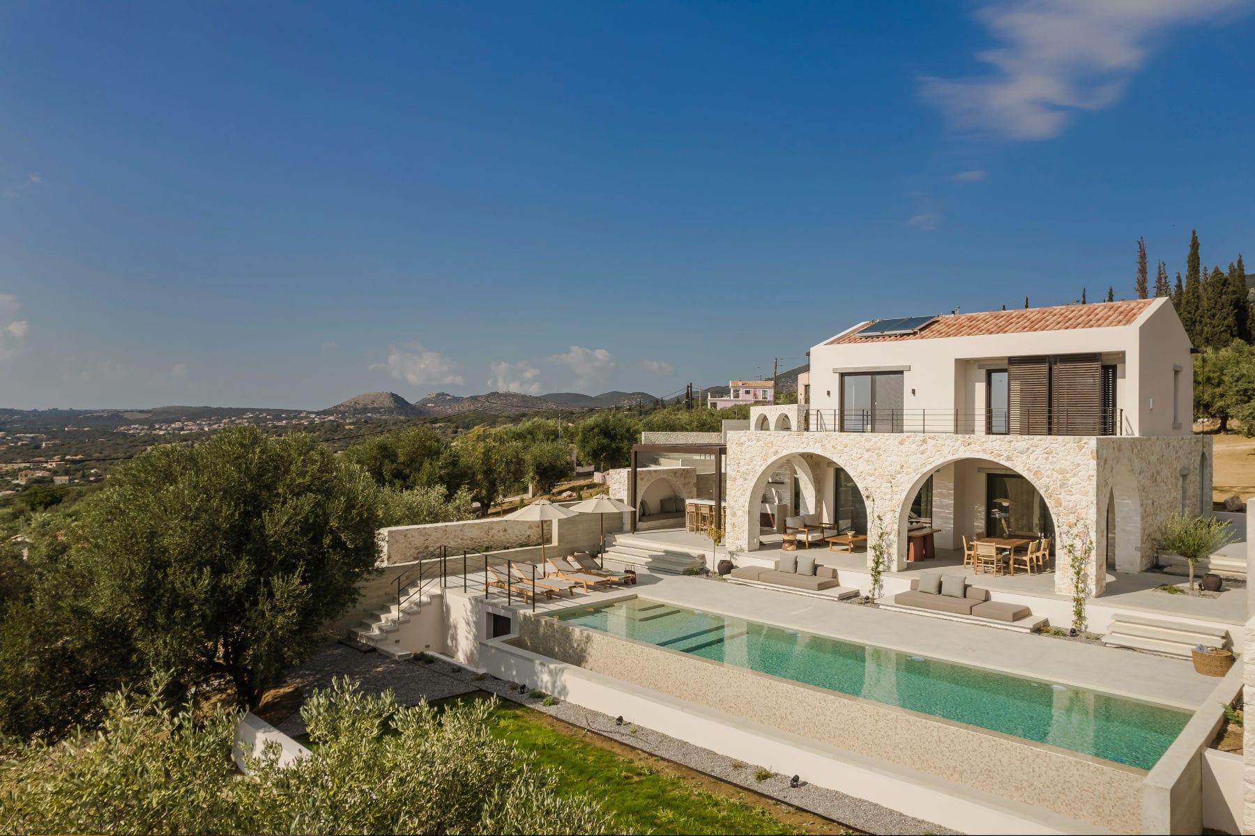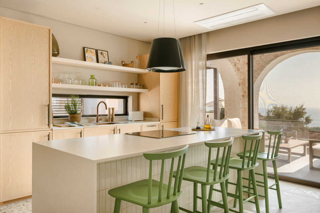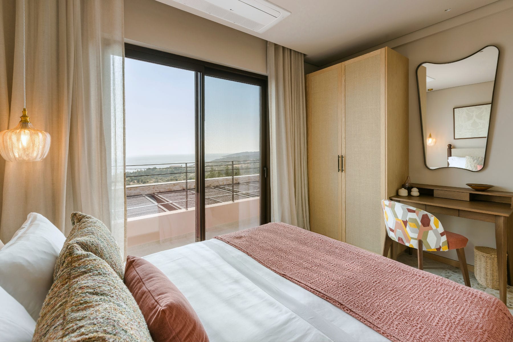 Deluxe Villa is located at the southern end of the Kerami Property with both sea and mountain facing views and is in close proximity to the kids playground. It features one King sized bed and one queen sized bed, spread across 100 m2 of refined living space.