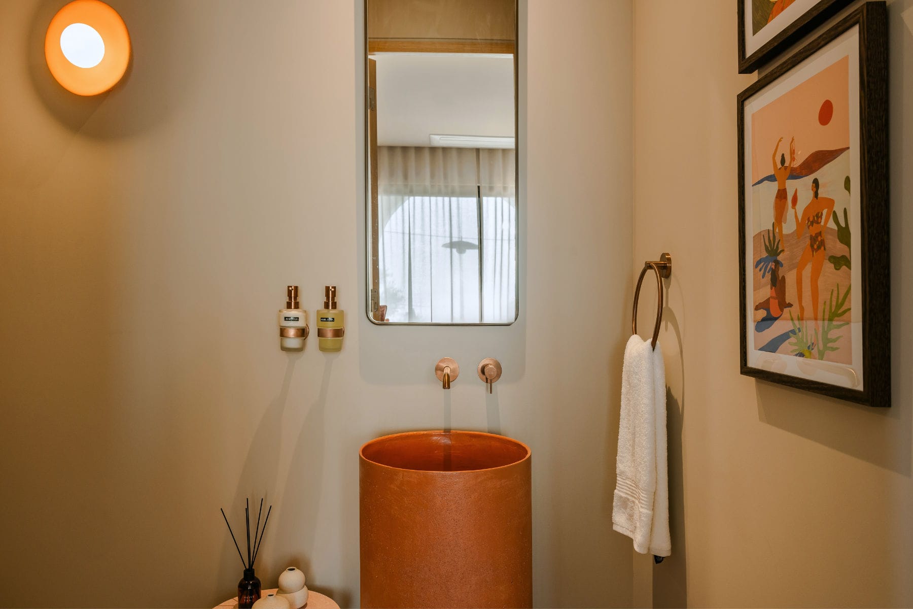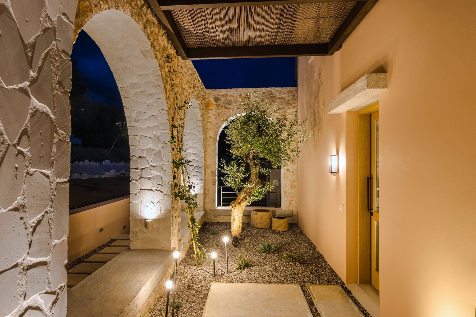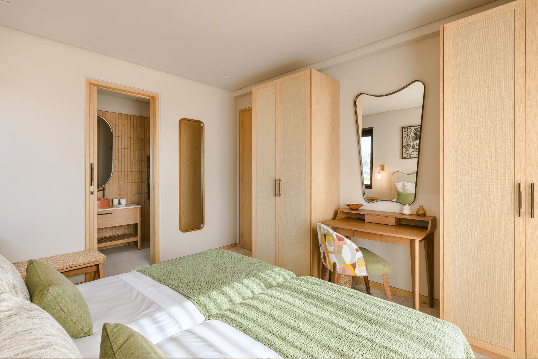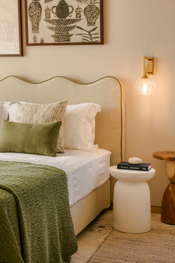 Ascending on the upper floor level, there are two bedrooms with ensuite bathrooms. The villa accommodates up to 4 guests. Additionally, guests have access to a shared children’s playground and organic vegetable garden.
