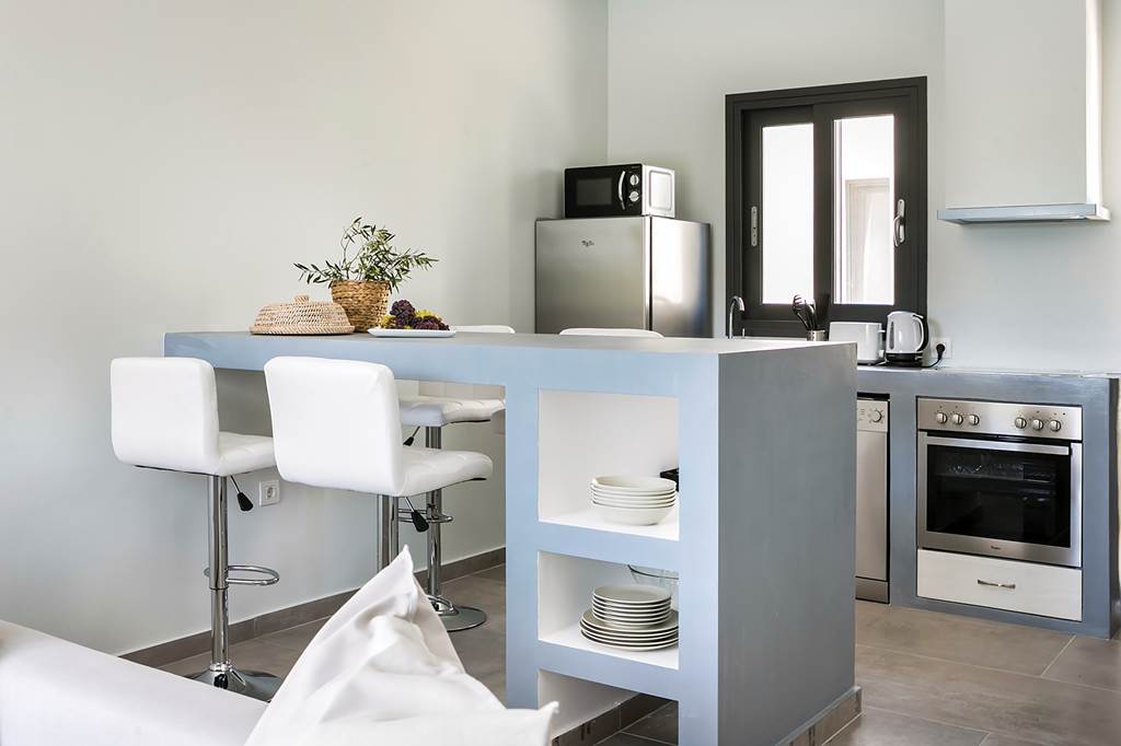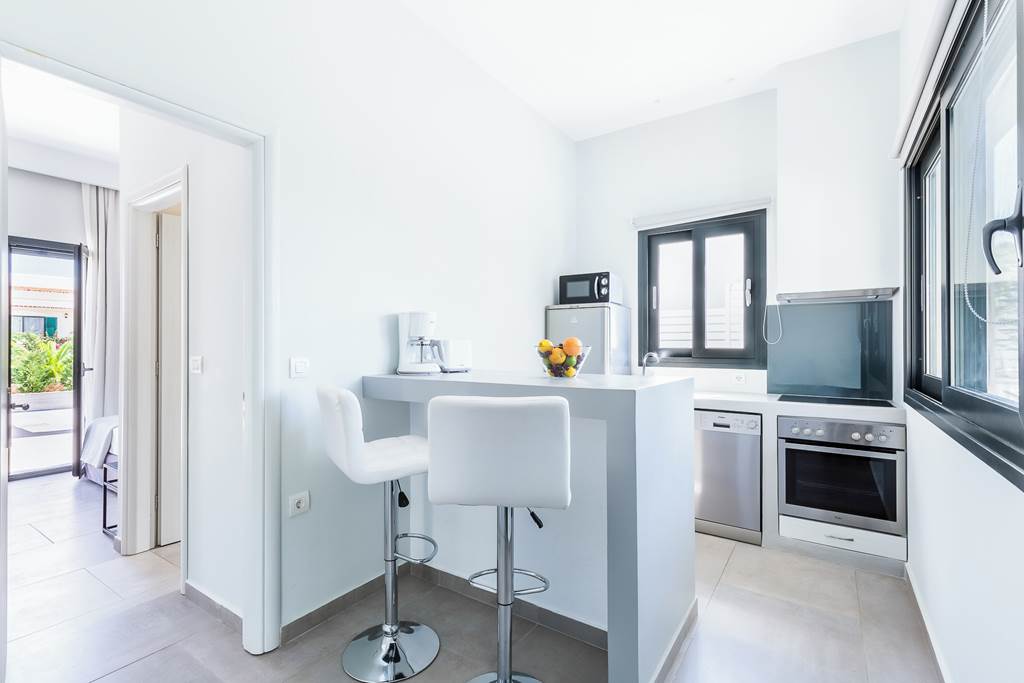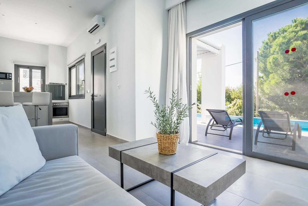 This smart, contemporary villa boasts a minimalist design, with both bedrooms featuring en suite shower rooms and patio doors that open directly onto the private pool terrace. The open-plan living space includes a cozy lounge, a breakfast-bar-style dining area, and a cleverly designed compact kitchen—perfect for preparing snacks and light meals.