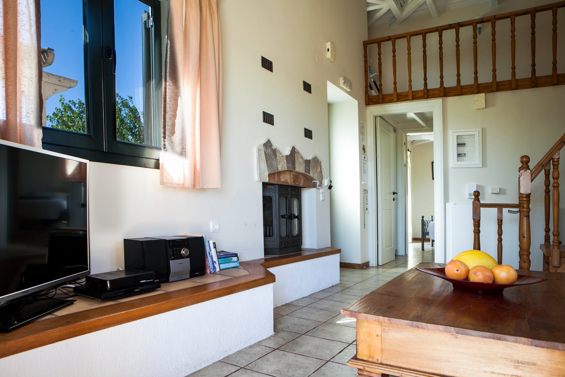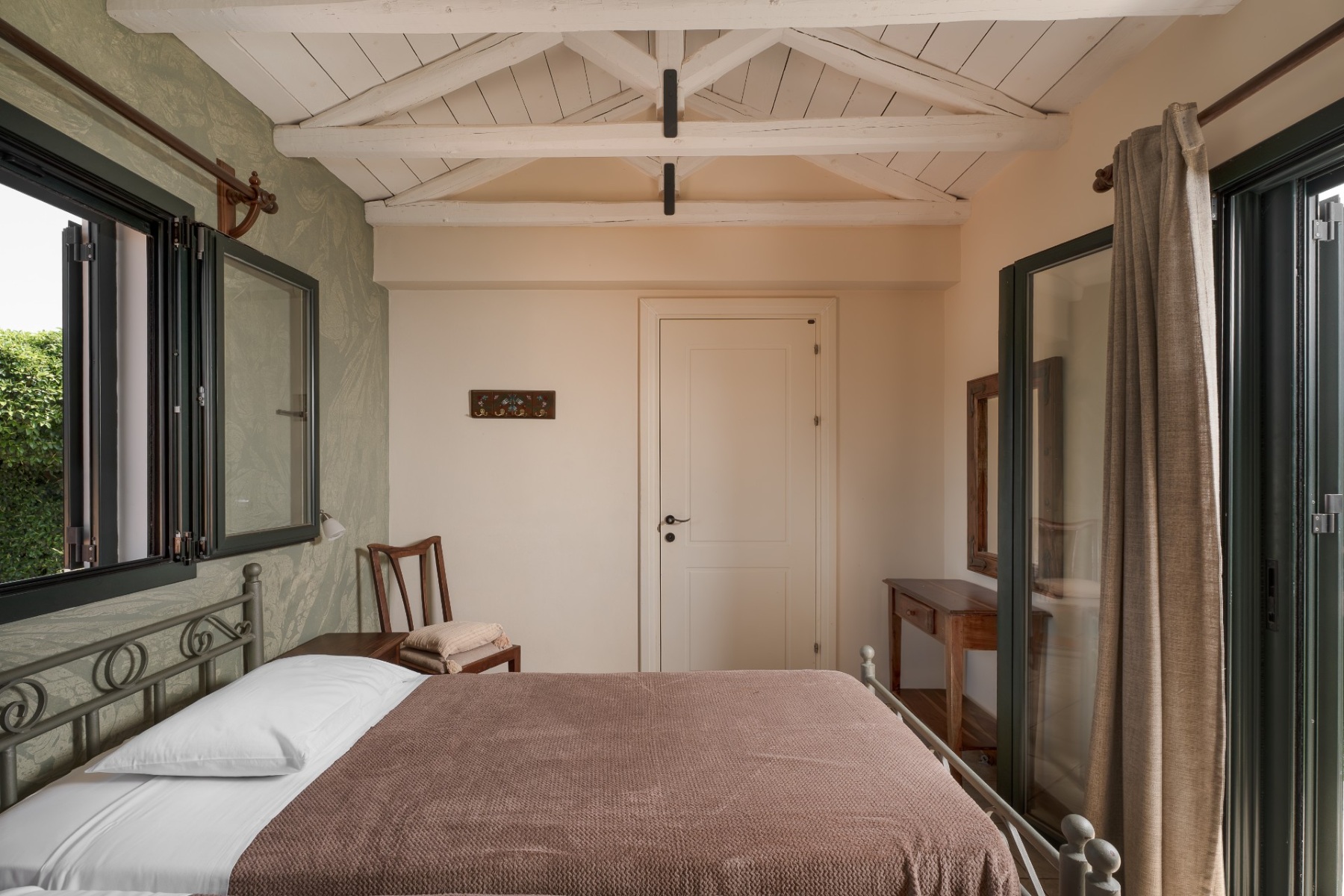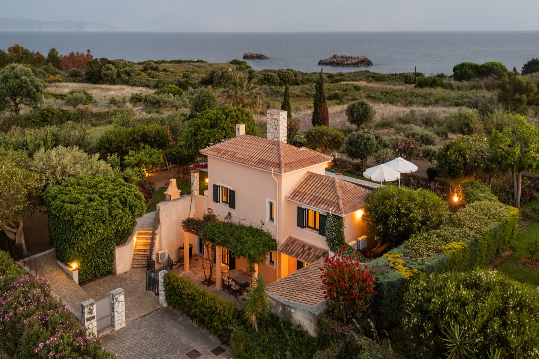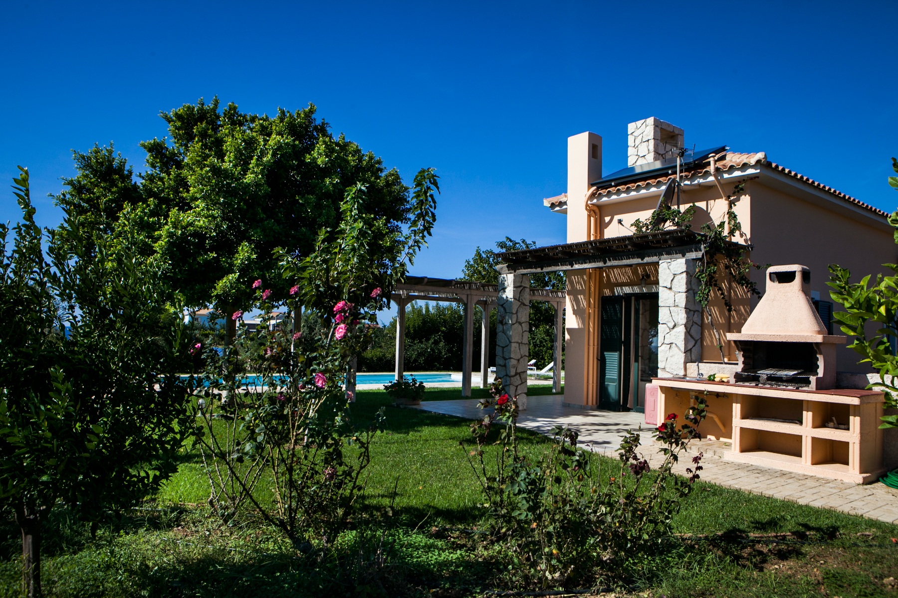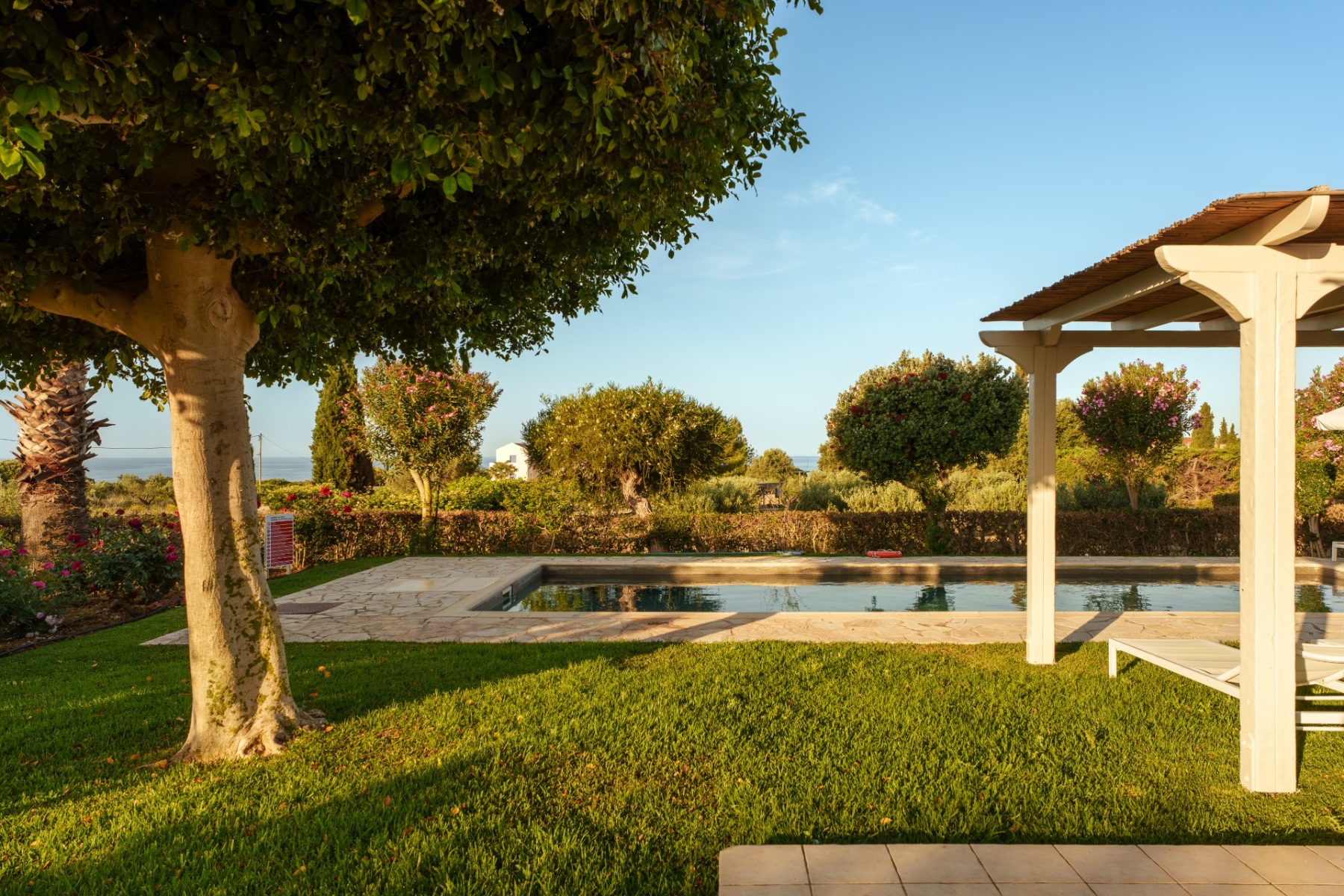 Outside, guests can unwind beneath the wooden pergola, take in the panoramic Ionian Sea views, or enjoy al fresco dining with a barbecue set against a backdrop of lush greenery. The calm, inviting ambiance extends seamlessly from the interiors to the gardens.