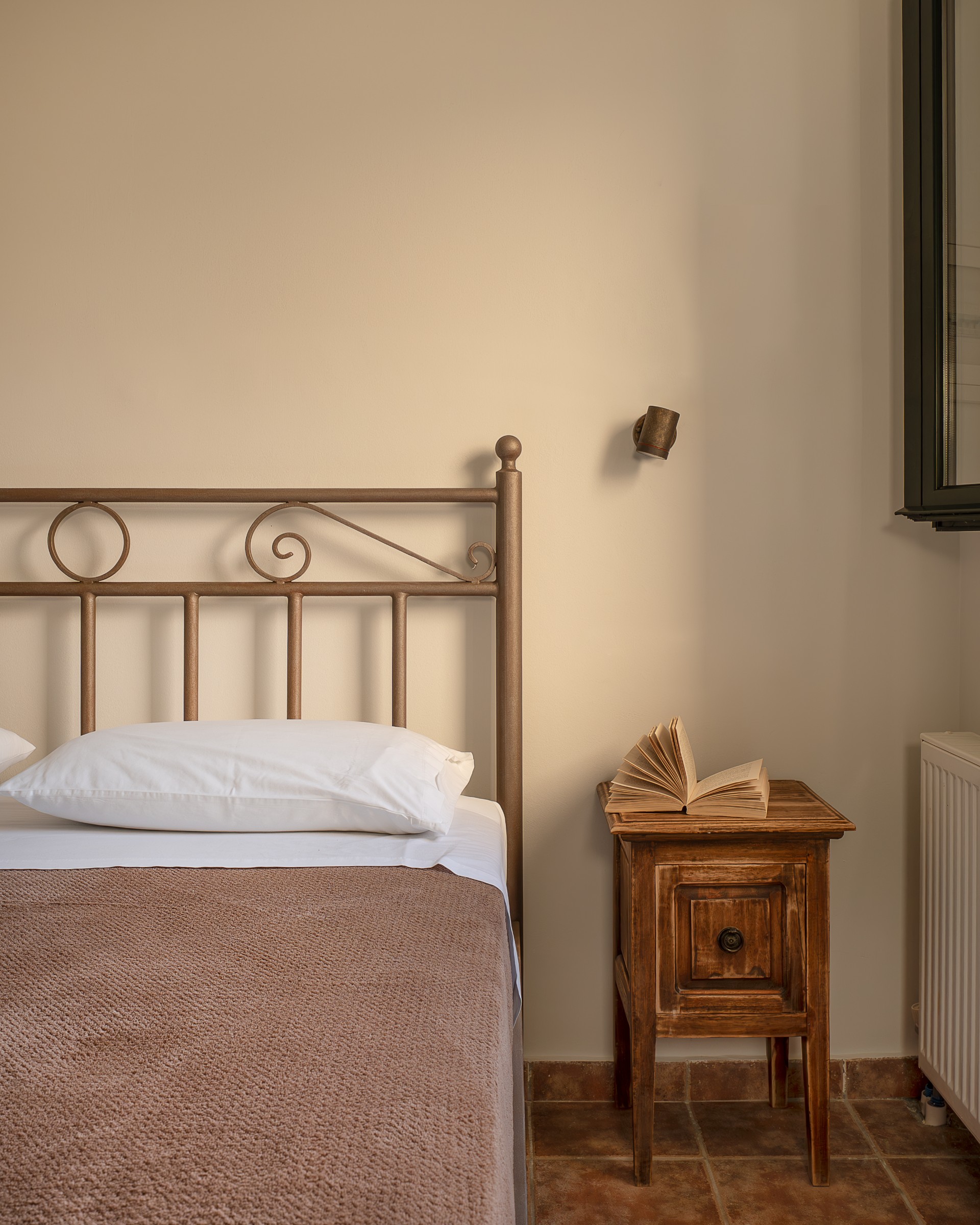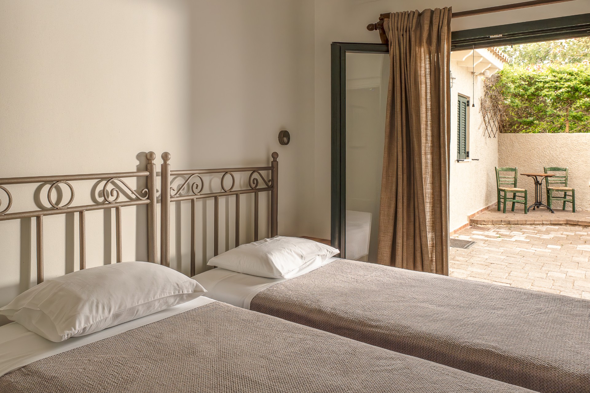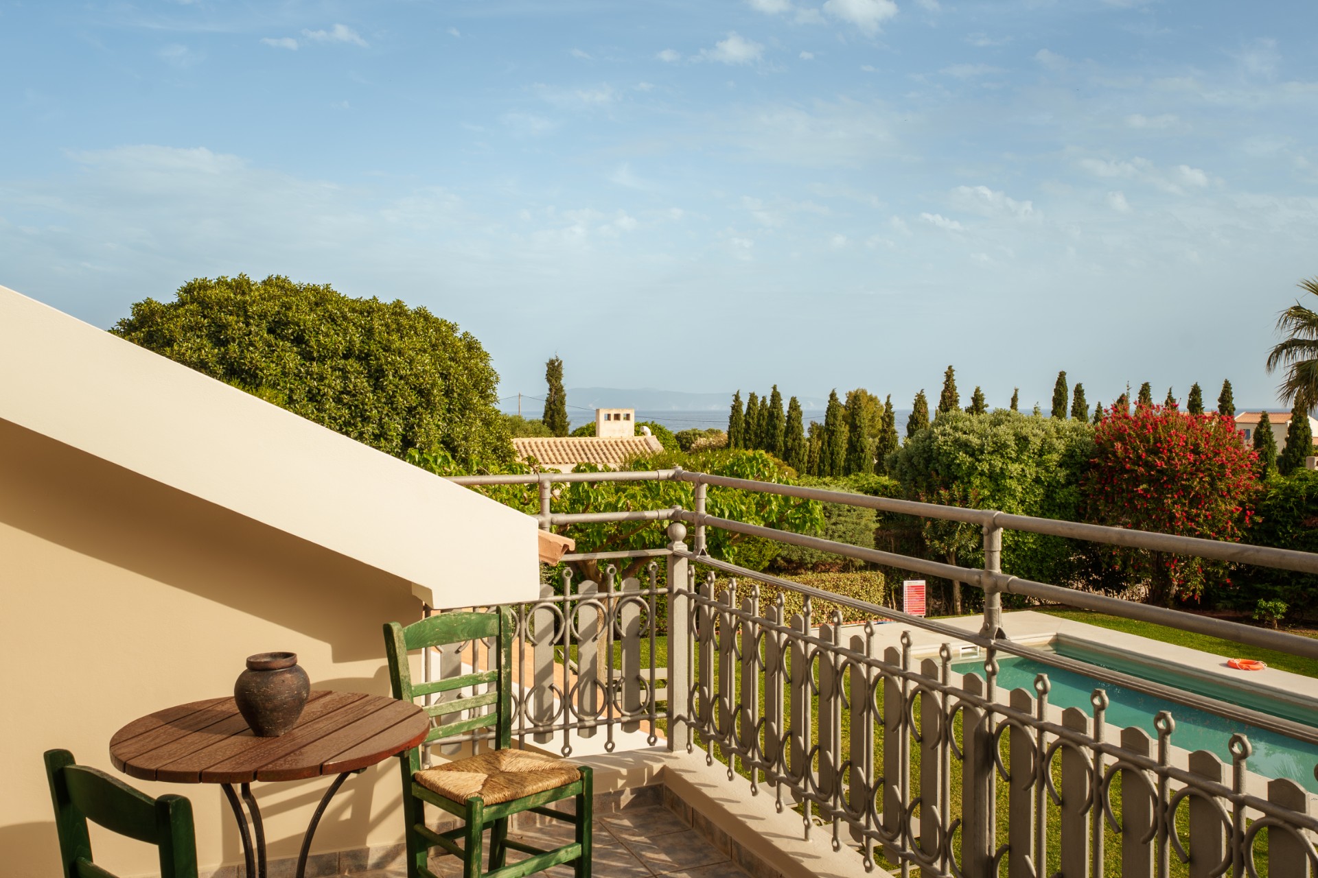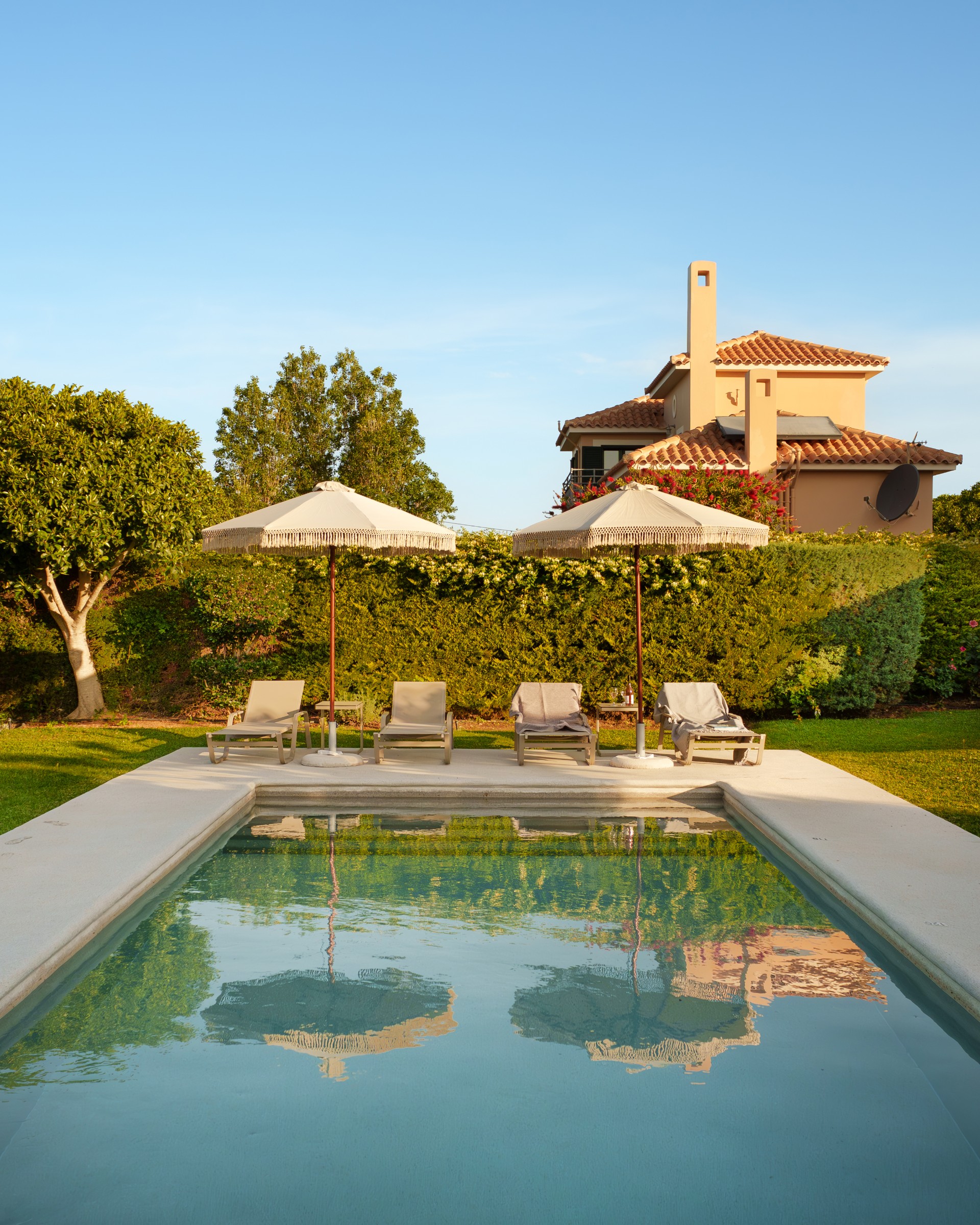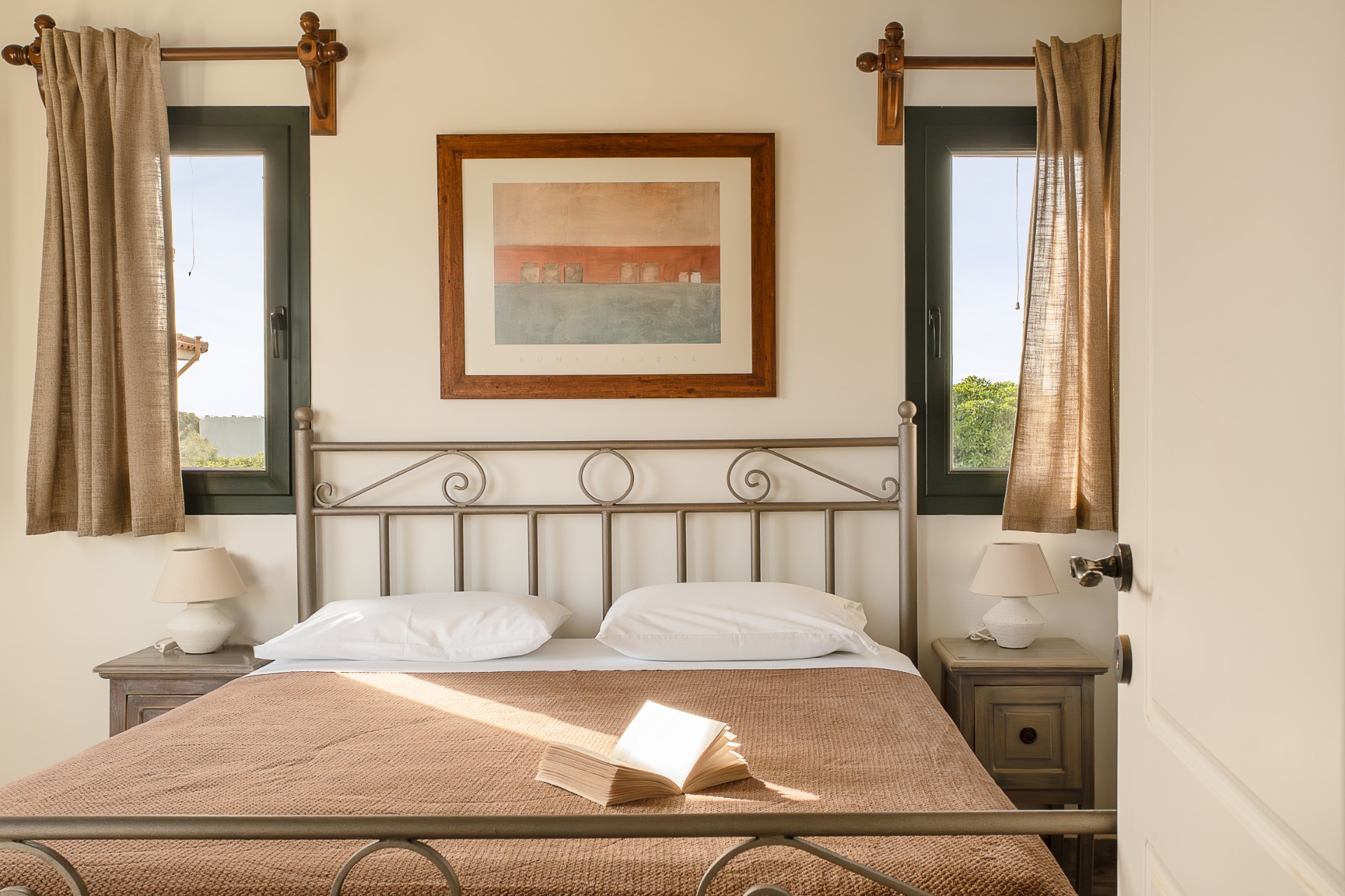 For added privacy, Villa Dionysus includes a separate bedroom annex with its own private patio area, perfect for guests seeking a quiet retreat. The traditional-style bedrooms are accented with subtle pops of colour, complementing the overall restful ambiance that extends throughout the home.