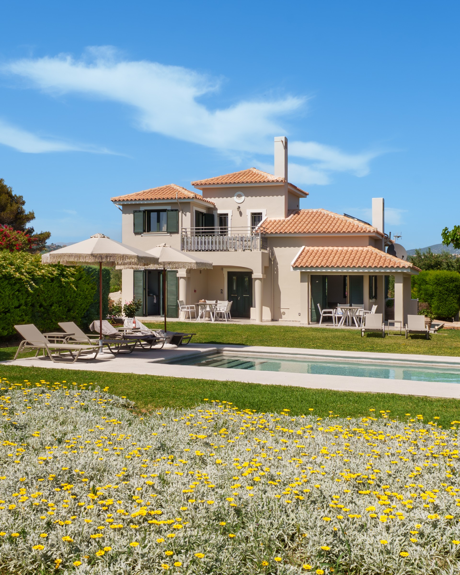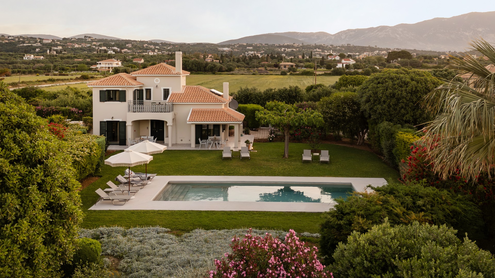 Villa Dionysus is a delightful retreat located on the outskirts of the tranquil village of Svoronata, nestled between the serene countryside and the shimmering coastline. Surrounded by beautifully maintained gardens and expansive manicured lawns, this charming property offers a peaceful setting with captivating sea views and a large private swimming pool at its heart.