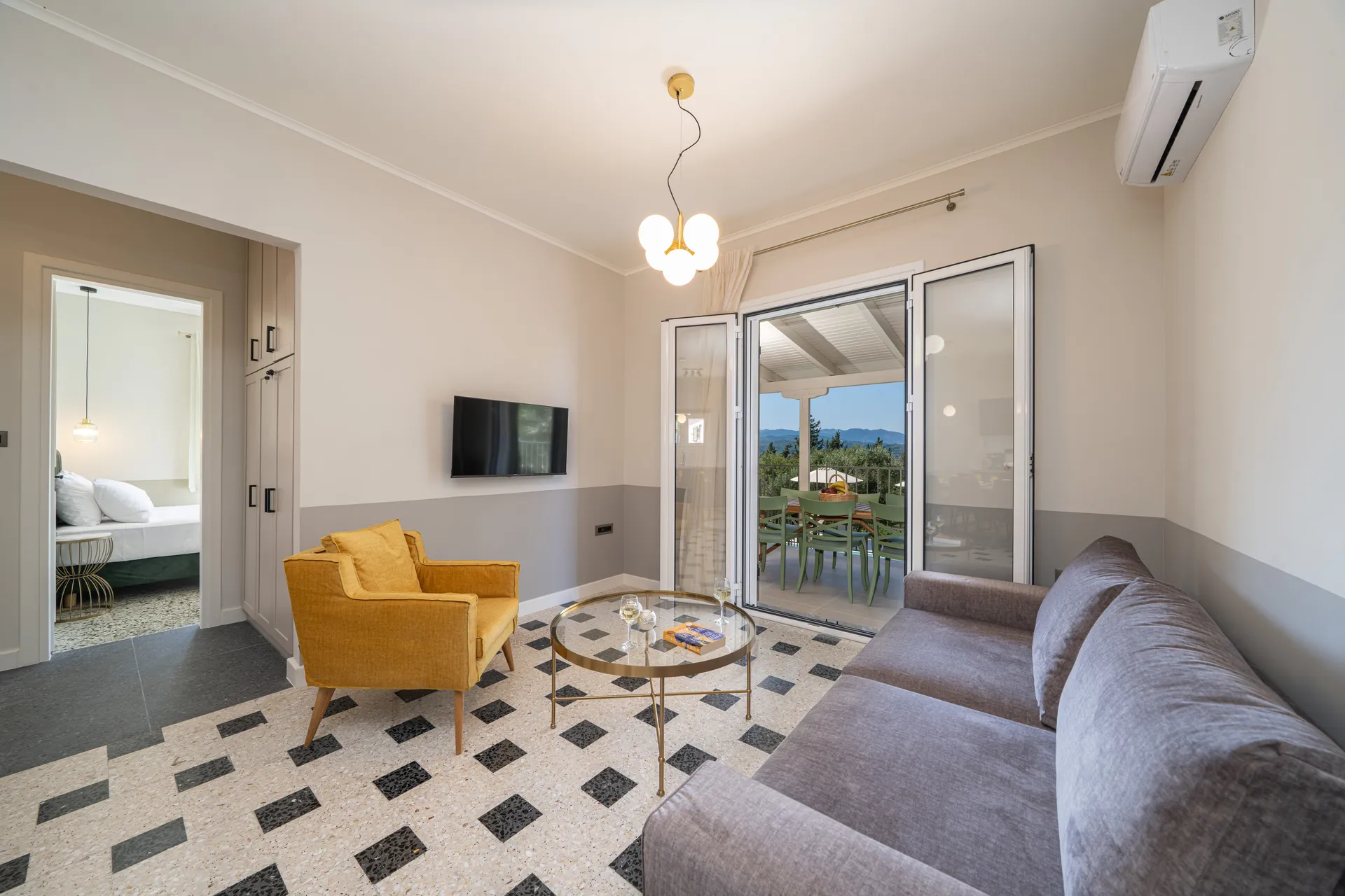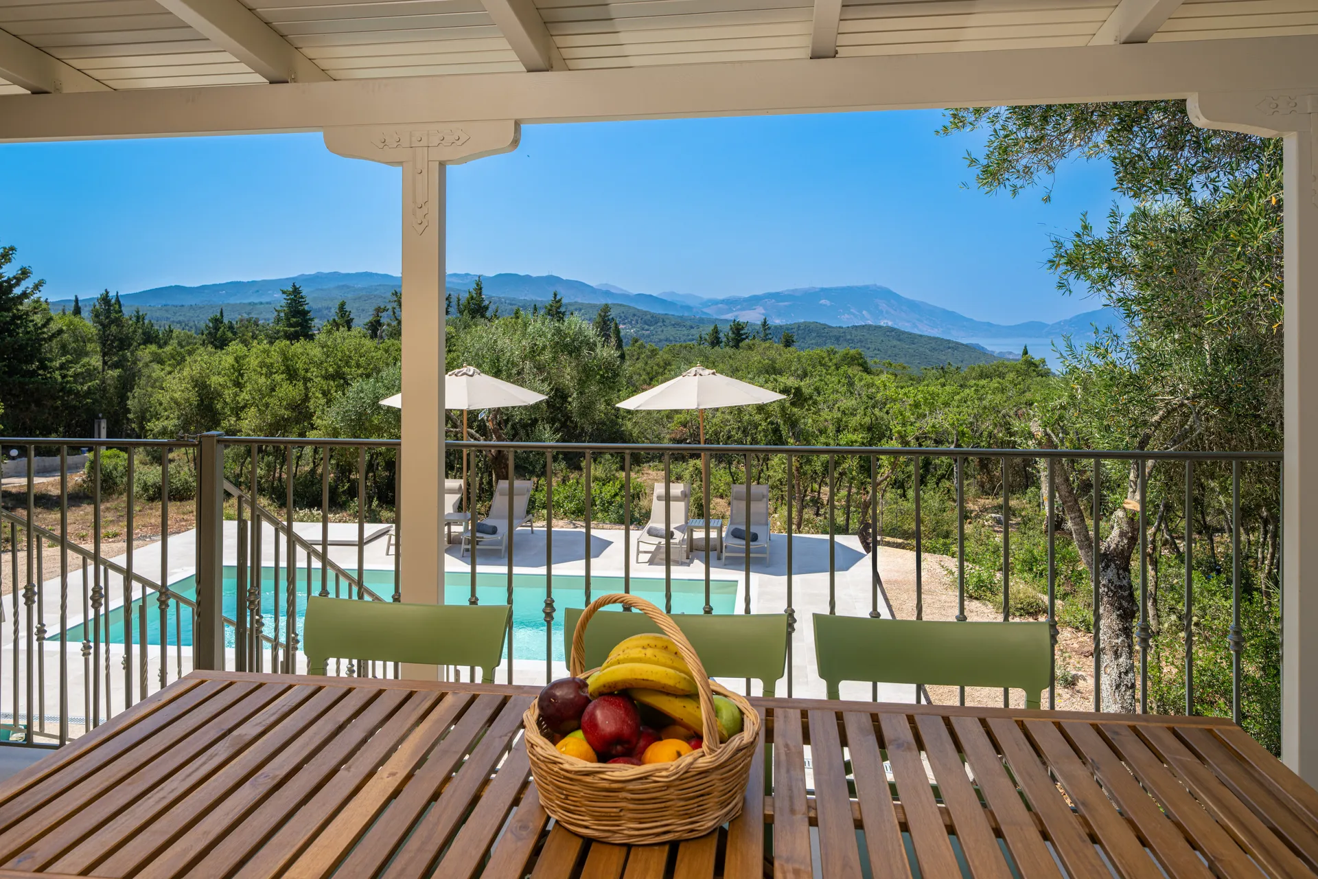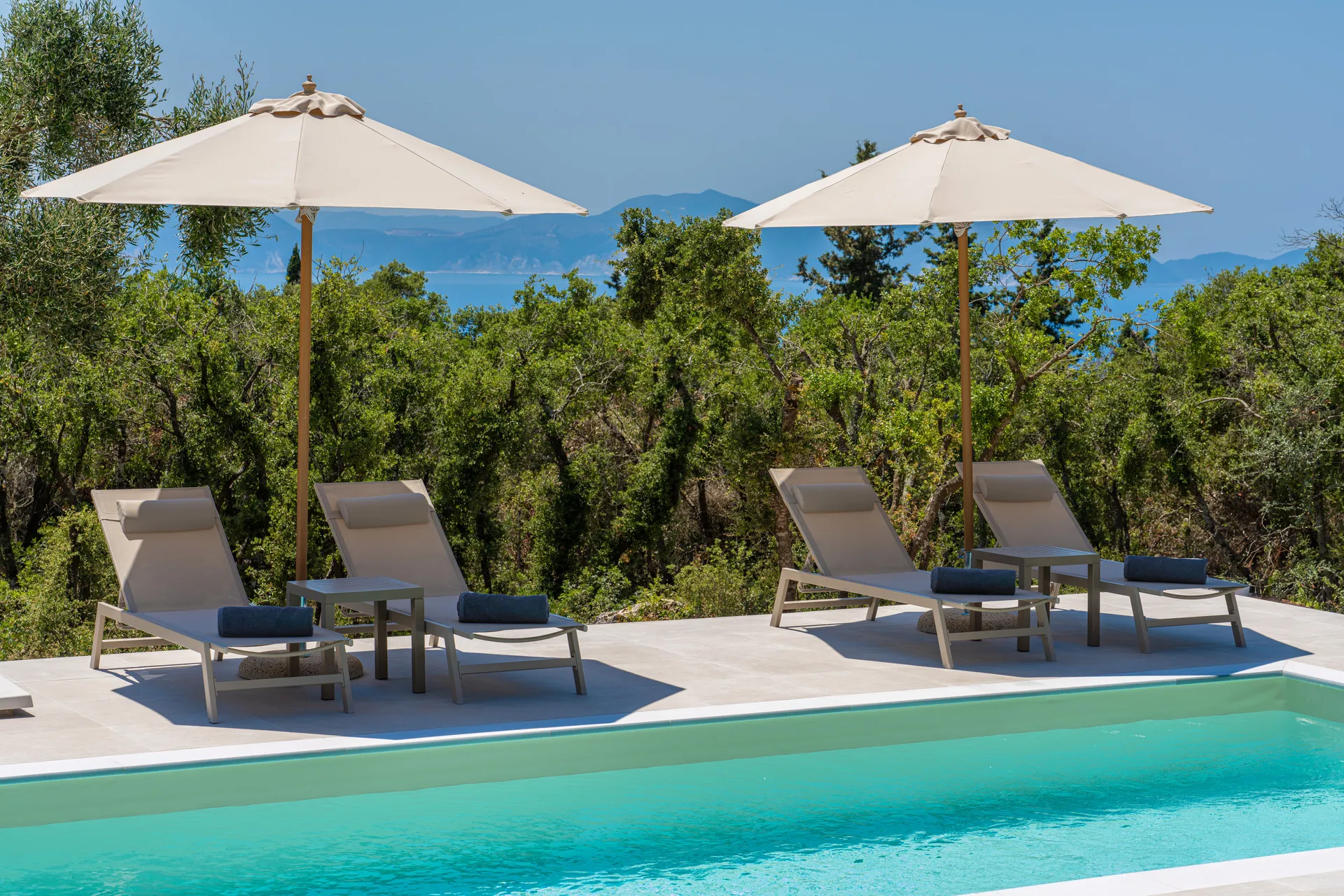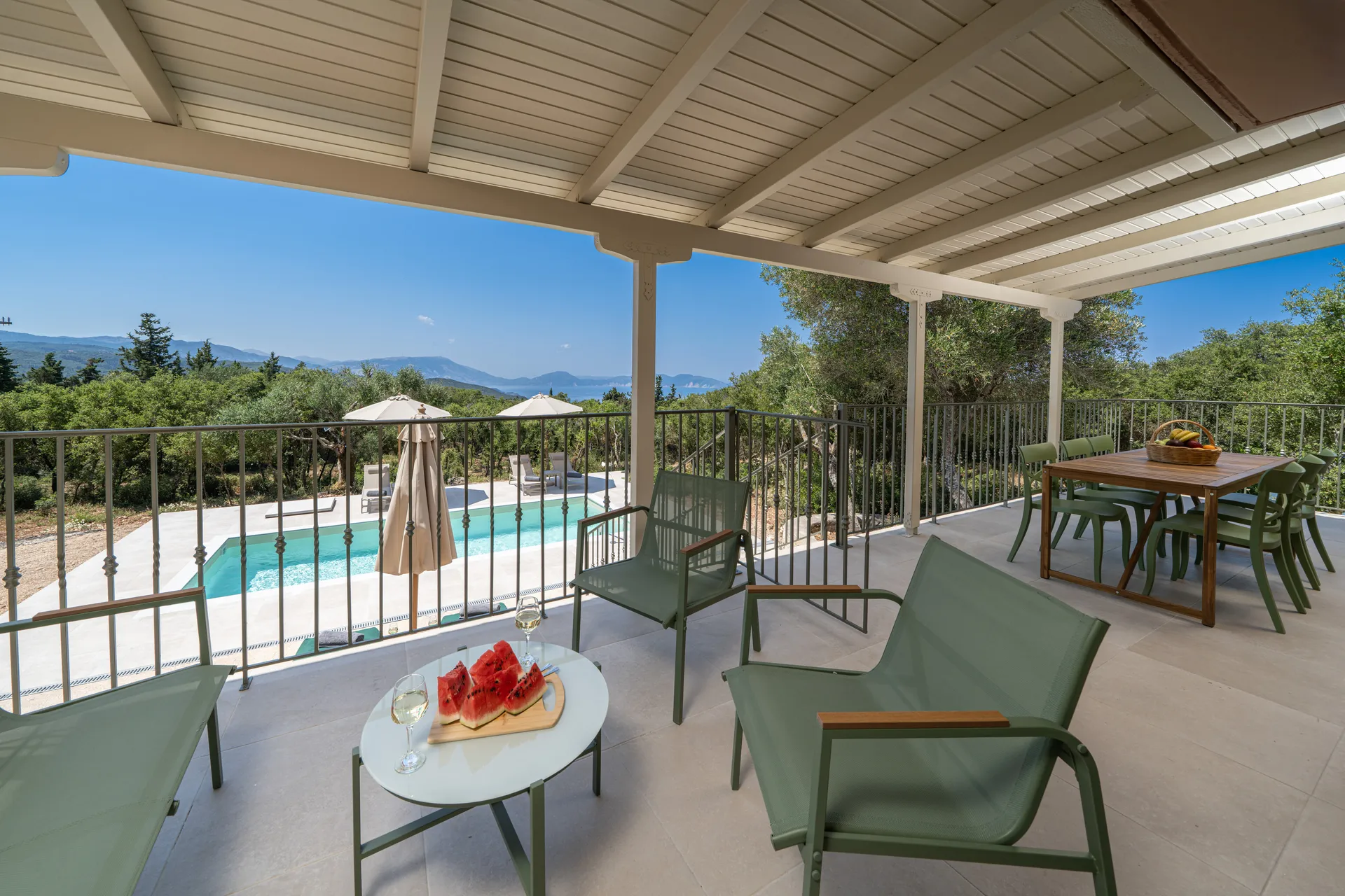 Outdoors, guests can enjoy a private swimming pool, shaded lounge areas, sunbeds, a dining terrace, and uninterrupted sea views—perfect for relaxing days and quiet evenings.