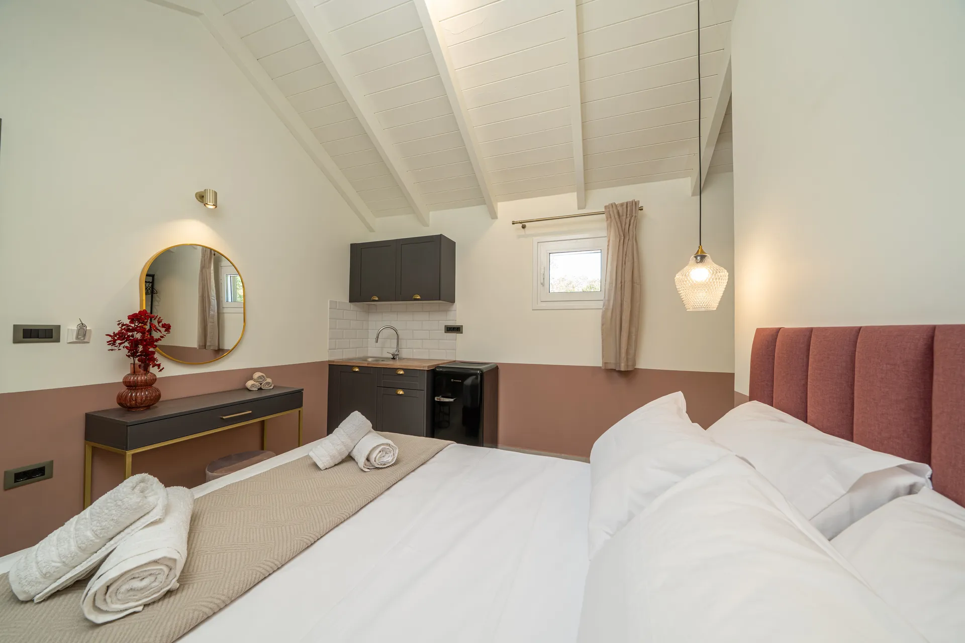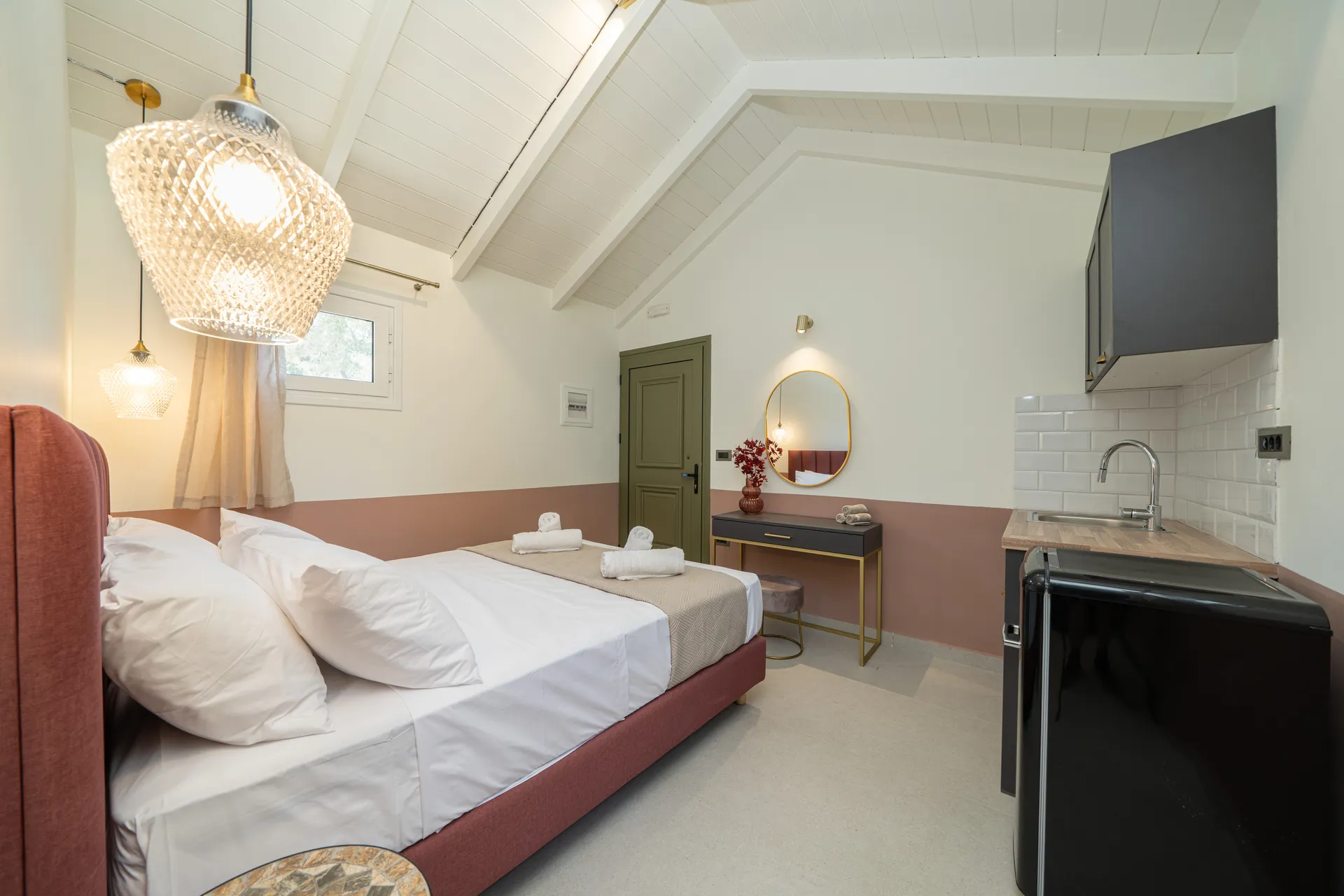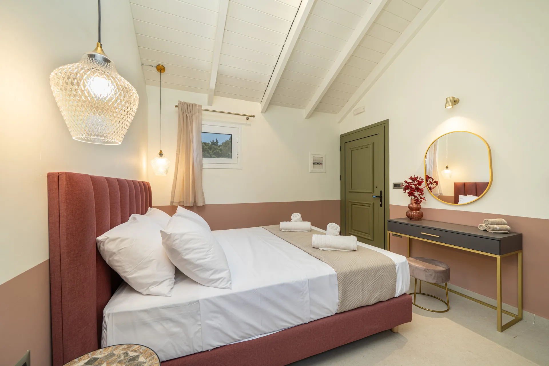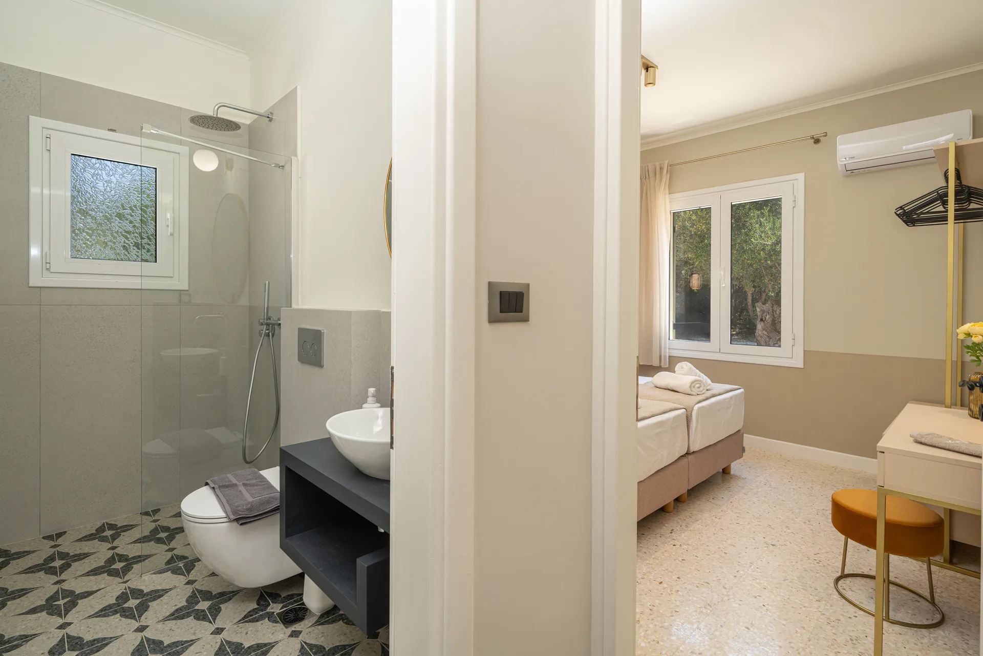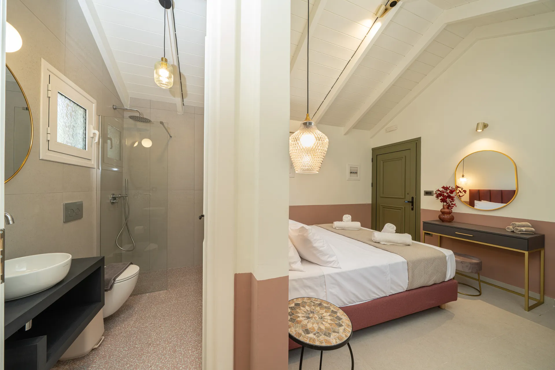 Outdoors, guests can enjoy a private swimming pool, shaded lounge areas, sunbeds, a dining terrace, and uninterrupted sea views—perfect for relaxing days and quiet evenings.