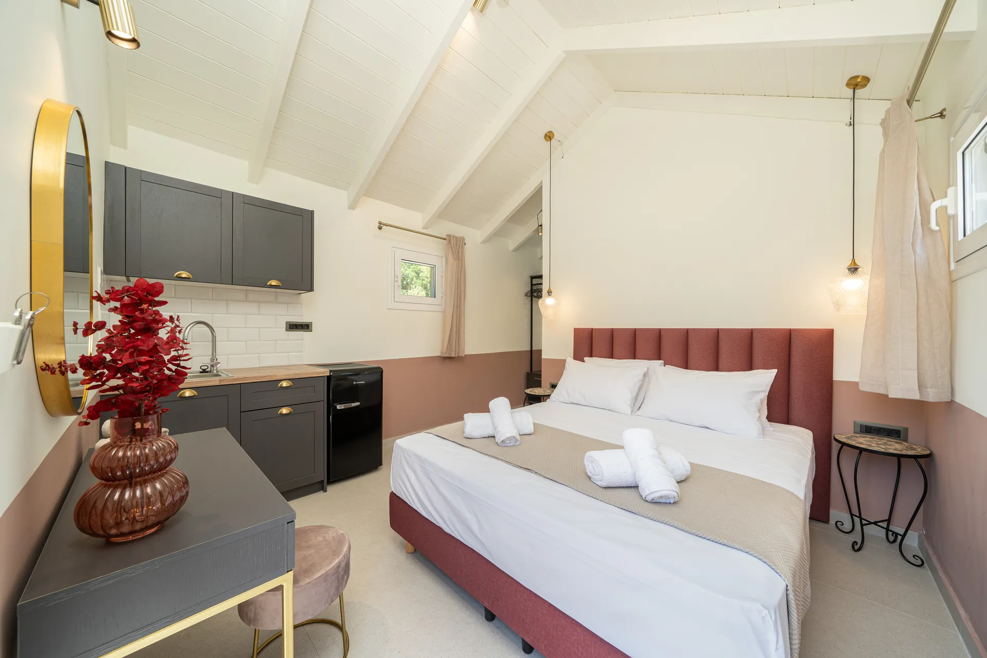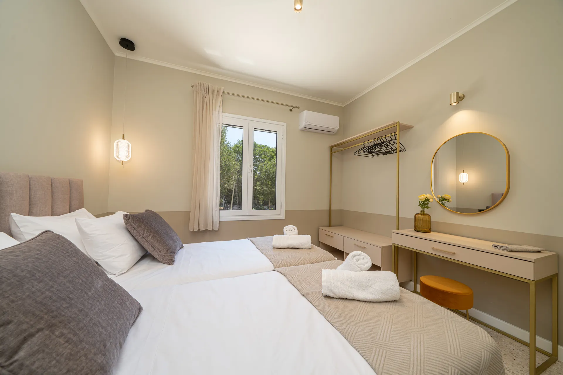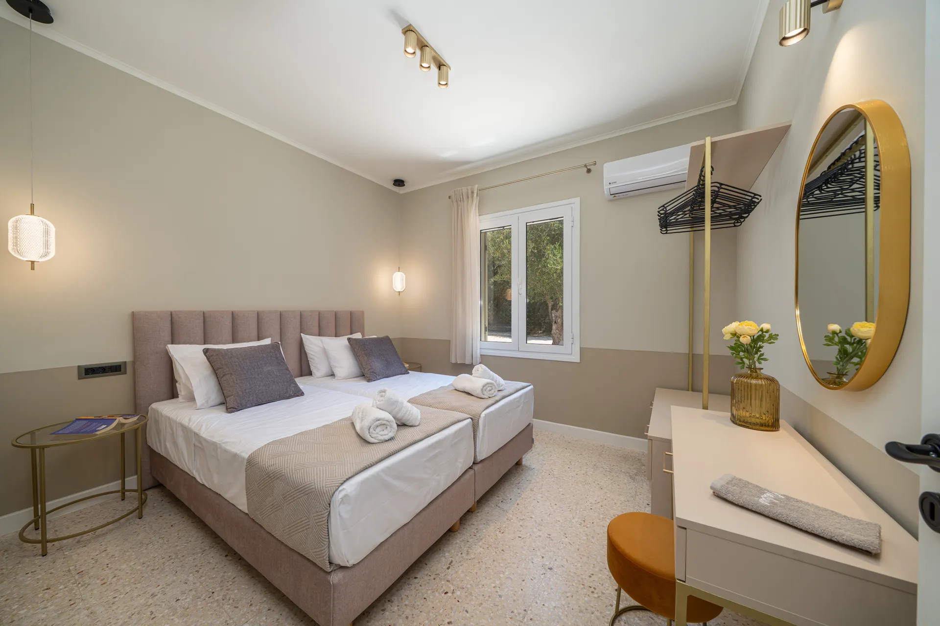 The villa accommodates up to six guests. The main house includes one double bedroom, one twin bedroom, two bathrooms, a fully equipped kitchen, and an open-plan living and dining area. A separate guesthouse provides an additional double bedroom with ensuite bathroom, kitchenette, and private entrance.